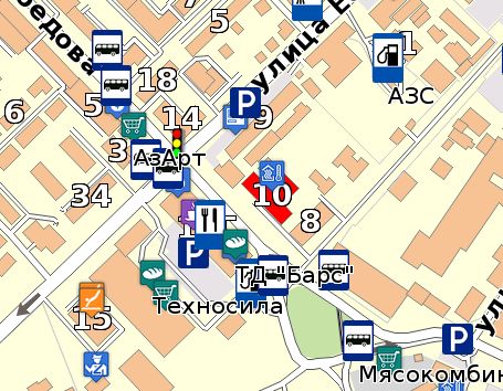 И объект центрируется. Если сразу же сделать поиск другого объекта, то тогда этот объект становится красным. Маршрут строится от первого объекта до второго. Объект тоже центрируется, но указателя нет, это несколько затрудняет обнаружение при большом количестве POI.