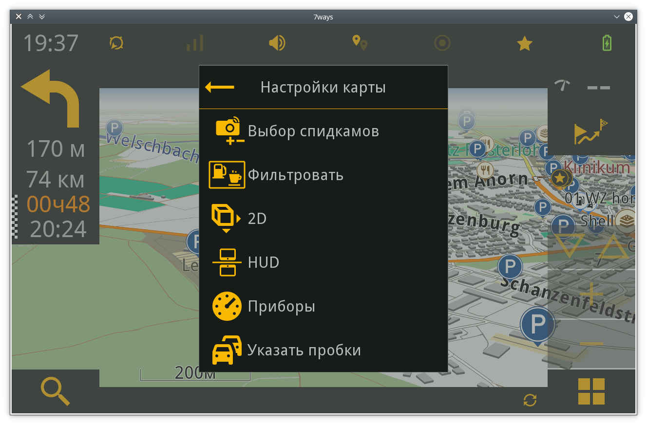 я читал на этом форуме в течение нескольких месяцев. 7ways, это лучшая программа Navi. Я использую его в Германии и Польше. Я сам работаю в ИТ-компании и решил настроить пользовательский интерфейс. За основу я взял Baltic и пересмотрел ее. Я хотел, чтобы это было просто и ясно. Я сам нарисовал векторную графику с помощью Inkscape, а затем сгенерировал ее как png с помощью скриптов Linux. Примечания: Режим день / ночь одинаковый для пользовательского интерфейса. Карты и POI, с другой стороны, темнее. Принцип: там, где цветной значок на пользовательском интерфейсе имеет цвет, там может быть запущено действие. Это упрощает работу и понимание программы. Я просто немного говорю по-русски : -), поэтому я взял файл русского языка. Но в скине есть некоторые исправления. Вот почему появились новые переменные, которые я дополнил в языковом файле также на русском языке. Пожалуйста, проверьте, правильно ли это.