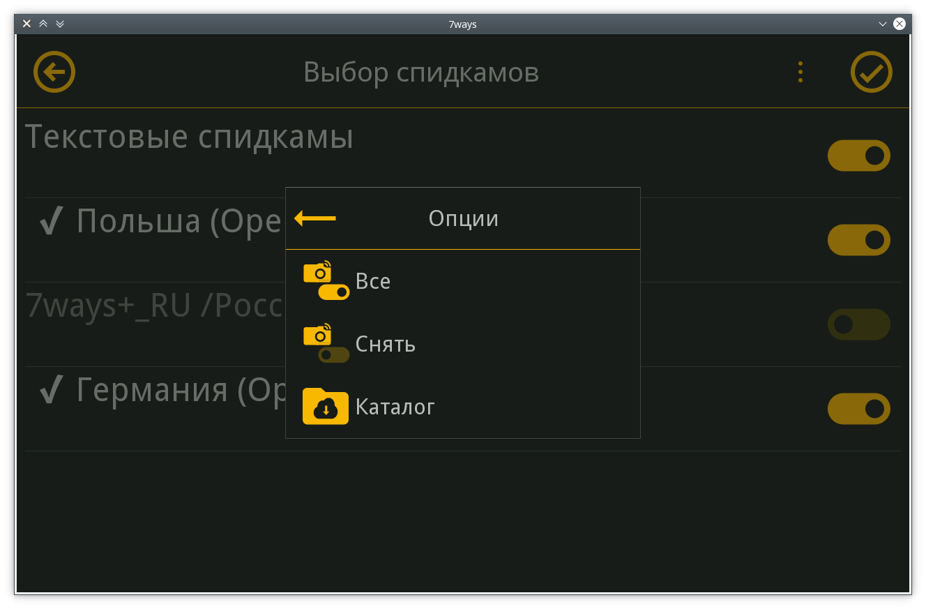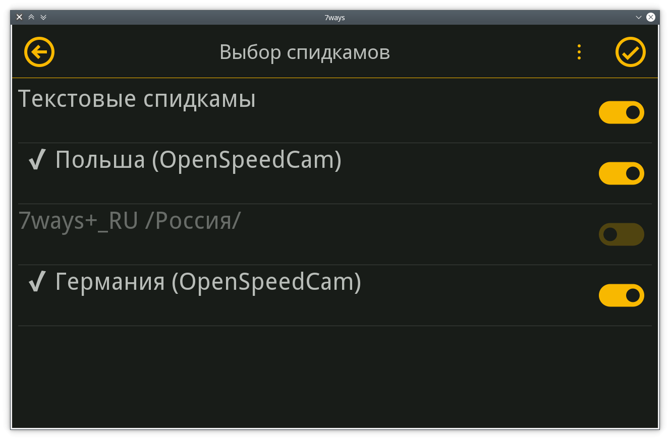 Спасибо за ссылки. Я помню, я тоже анализировал эти скины. Именно в этой версии я был настолько запутан, что вначале я просто не понимал, к чему это вообще приводит. Программирование пользовательского интерфейса для 7ways является defacto с открытым исходным кодом. Проблема в том, что разработчики не согласились с терминами и определениями. Если появится новый разработчик, ему придется изучить все мнения, чтобы понять, что программа вообще с ним делает. Термин "speedcam" в принципе неверен. Речь идет не только о контроле скорости, но и о любых предупреждениях, которые вы можете запрограммировать на основе координат. Так что а теперь перейдем к делу с выбором "speedcams". Это, конечно, неправильно названо. Здесь не включаются и отключаются отдельные типы Speedcams (например, включение-выключение вспышки красного света), но здесь расширения (в случае "speedcams") включаются и отключаются как пакеты.